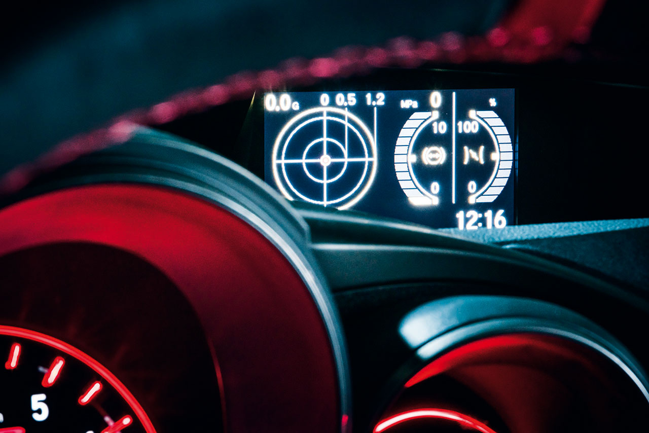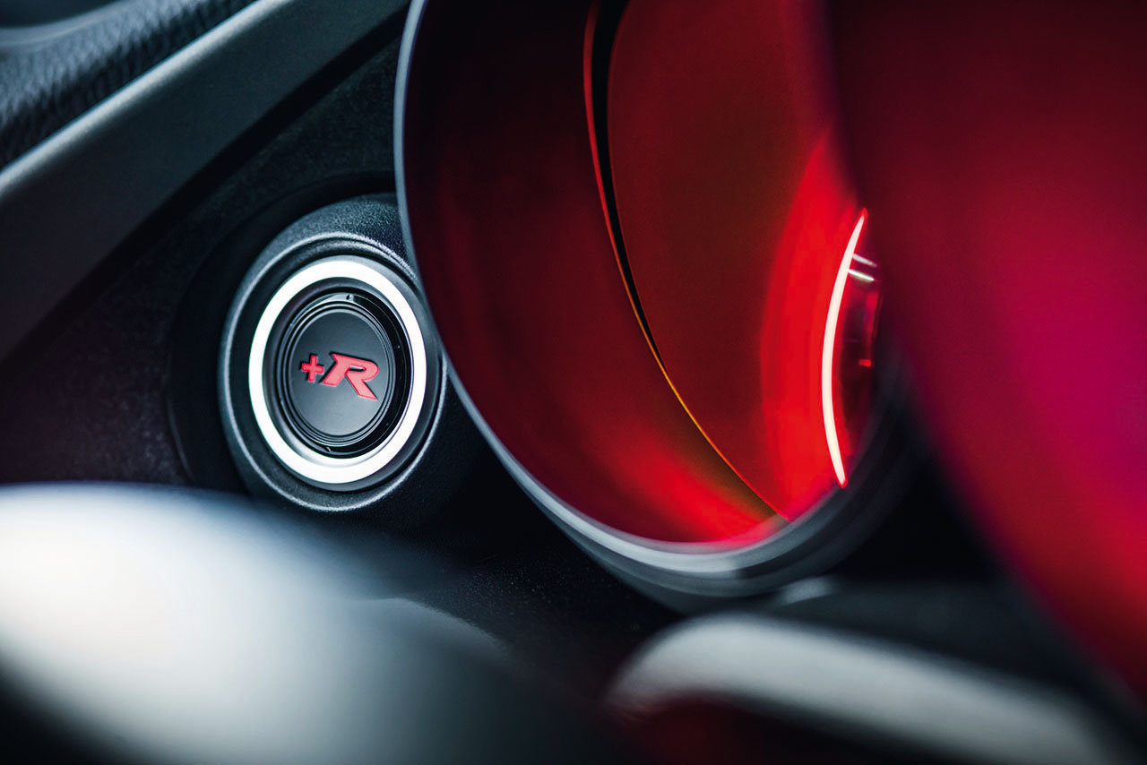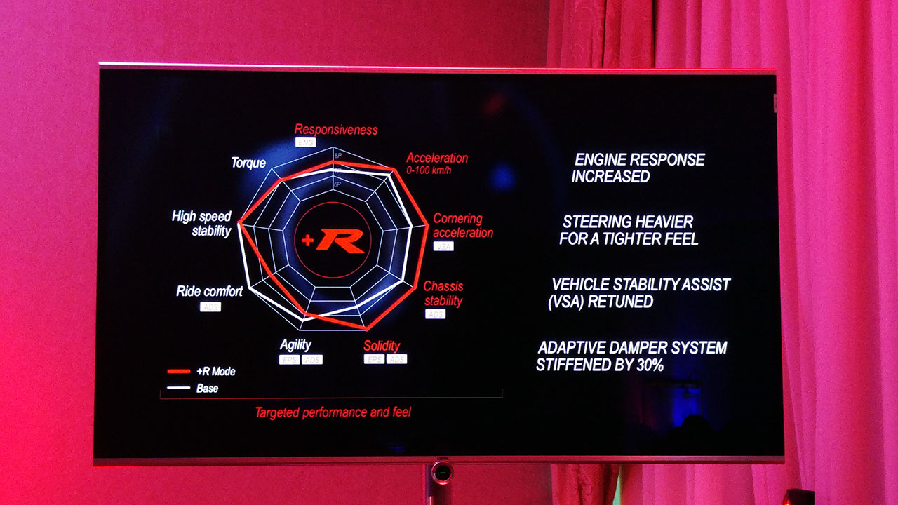 Ao final das duas primeiras voltas, foi-me dada autorização para accionar o modo R+, que além de alterar o esquema de cores do painel de instrumentos, bem como do computador de bordo para um vermelho vivo, ajusta os amortecedores adaptáveis para uma configuração mais rígida (em 30%), melhora a resposta do motor com a oferta de maior binário a baixa rotação, direcção mais curta e pesada, reduzindo assim a assistência da mesma. Através do ecrã i-MID, passamos a poder aceder aos menus Type R, compostos por quatro ecrãs específicos.