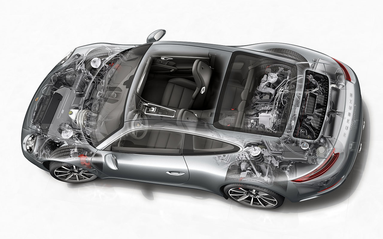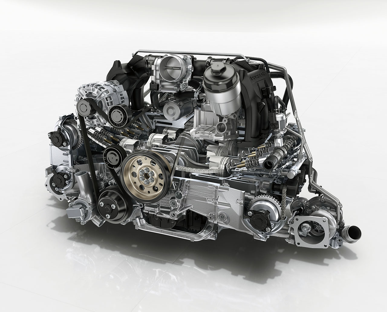 Mas deixemo-nos de coisas más e falemos das novidades que todos aguardávamos, as alterações às motorizações. Com mais de 40 anos dedicados ao desenvolvimento de motorizações sobrealimentadas (com o histórico 911 Turbo), a Porsche alargou para a restante gama a utilização da sobrealimentação (com dois turbos), permitindo assim aumentar o desempenho ao mesmo tempo que se reduz os consumos em 12 por cento, o que equivale uma redução de um litro por cada 100km. Para tal, o modelo de entrada passa agora a usar um seis cilindros opostos com três litros de cilindrada e dois turbos, o que lhe garante 370cv de potência e 450Nm de binário, estando a versão 911 Carrera S equipada com o mesmo bloco, porém com 420cv e 500Nm, o que corresponde a um aumento de 20cv e 60Nm face aos modelos pré-renovação, respectivamente.