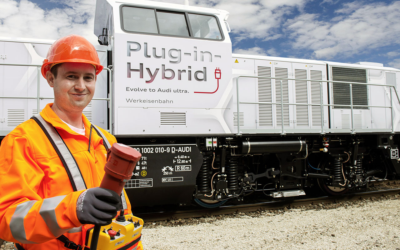 Four rings on rails: A new plug-in-hybrid-locomotive transports components and finished Audi models in a more climate-friendly way at the Audi plant in Ingolstadt.…Uma locomotiva. Sim, leu bem, a Audi revelou a chegada de uma nova locomotiva Híbrida Plug-In, criada pela Alstom, com 1000cv de potência. Esta locomotiva, que fará parte da frota que abastece a fábrica de Ingolstadt, permitirá tornar a área em redor da mesma mais sossegada e bem mais agradável, uma vez que permitirá reduzir em 60 toneladas por ano as emissões de CO2 emitidas pelos 15 comboios diários que percorrem os 18km de carris em torno da fábrica.