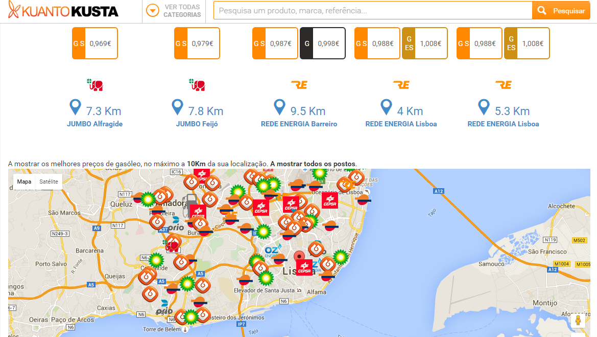Usando o centro da cidade de Lisboa, como exemplo, poderá pesquisar pelo abastecimento do depósito do seu veículo com gasóleo simples, sendo encontrado, num raio máximo de 10 km, cerca de 120 postos no KuantoKusta, com uma variação de cerca de 0,25 €/l entre o posto mais barato e o posto mais caro.