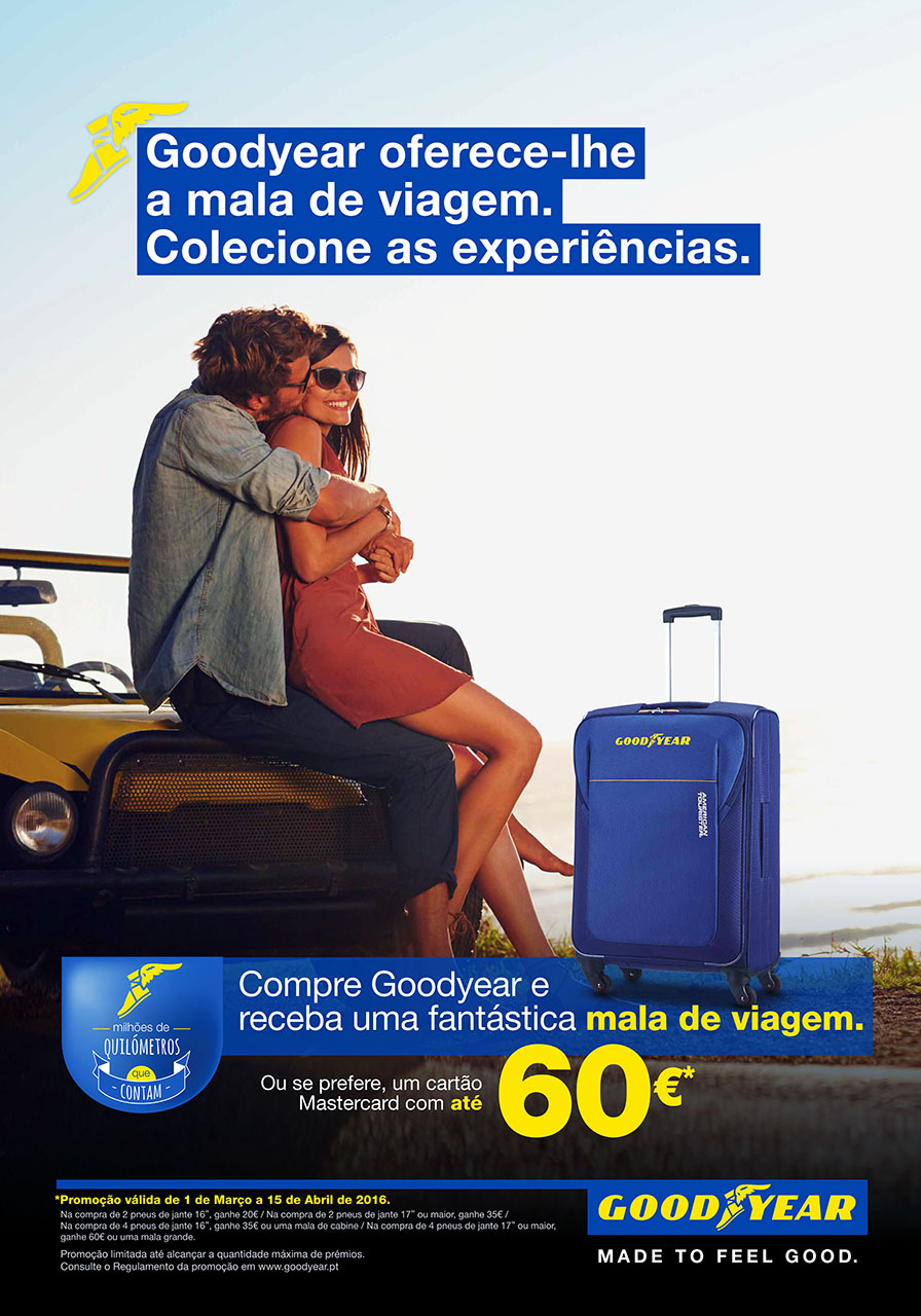 A Goodyear vai premiar os condutores com uma mala American Tourister ou com um cartão MasterCard de valor até 60 € na compra dos seus pneus Goodyear. A promoção estará disponível até o próximo 15 de Abril de 2016. Para beneficiar desta promoção, os condutores interessados têm de trocar e colocar pelo menos dois pneus Goodyear em qualquer um dos estabelecimentos aderentes.