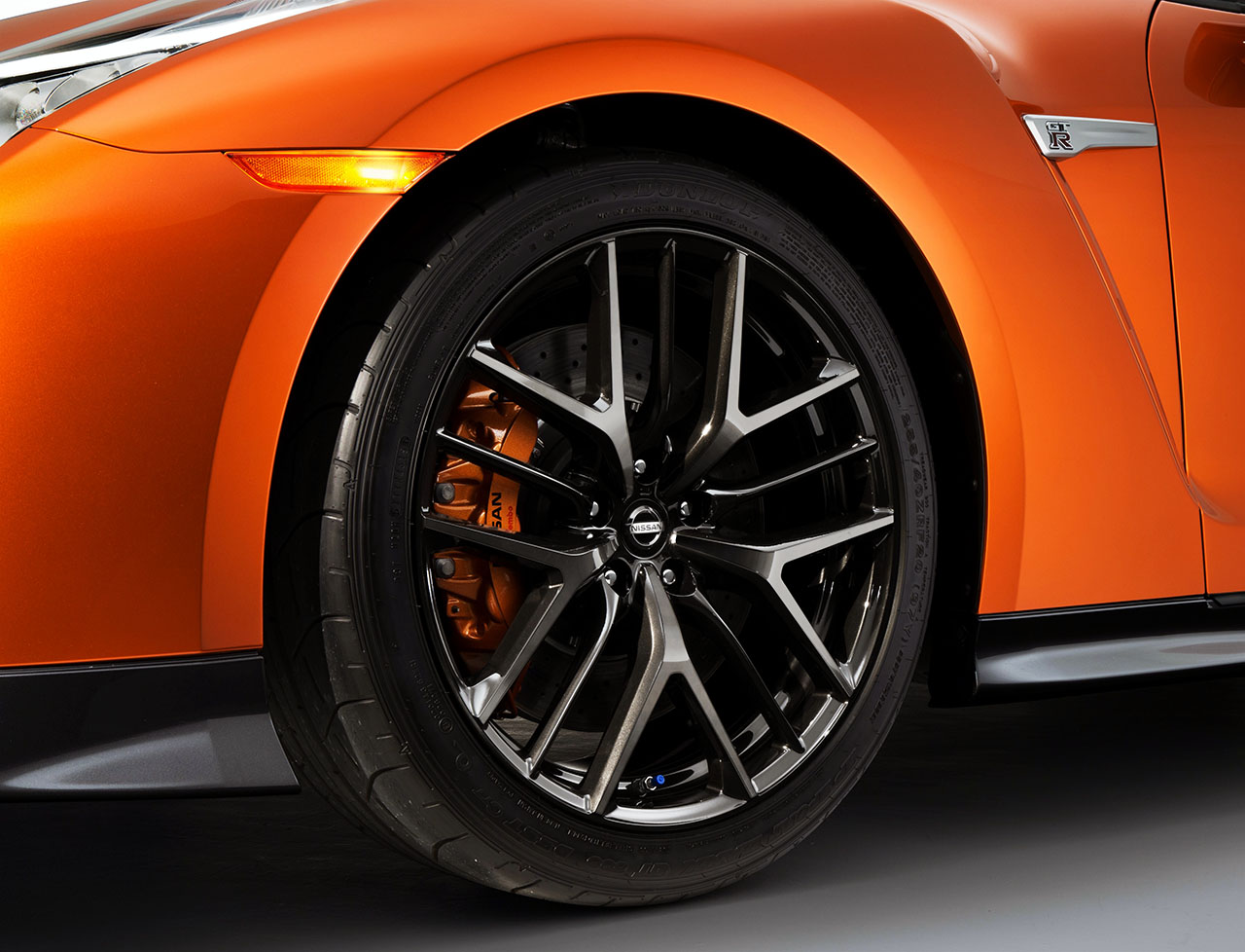 No exterior do novo GT-R recebe uma dianteira transformada, ao receber uma grelha com um “V” com acabamento cromado mate incorporado, associando-o à actual assinatura de design da marca. A grelha é também mais larga para permitir um melhor arrefecimento do motor e agora ostenta um padrão de rede em grelha actualizado. O novo capot foi redesenhado e reforçado para se integrar melhor com o visual da dianteira, tendo também o rebordo do deflector dianteiro sido redesenhado, bem como o para-choques dianteiro, que passa a incorporar saliências imediatamente abaixo dos faróis, proporcionando ao novo GT-R um visual de automóvel de competição.