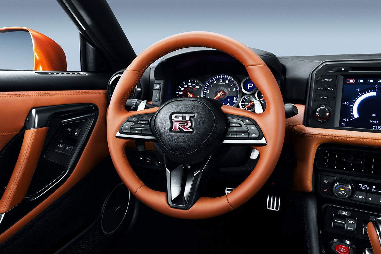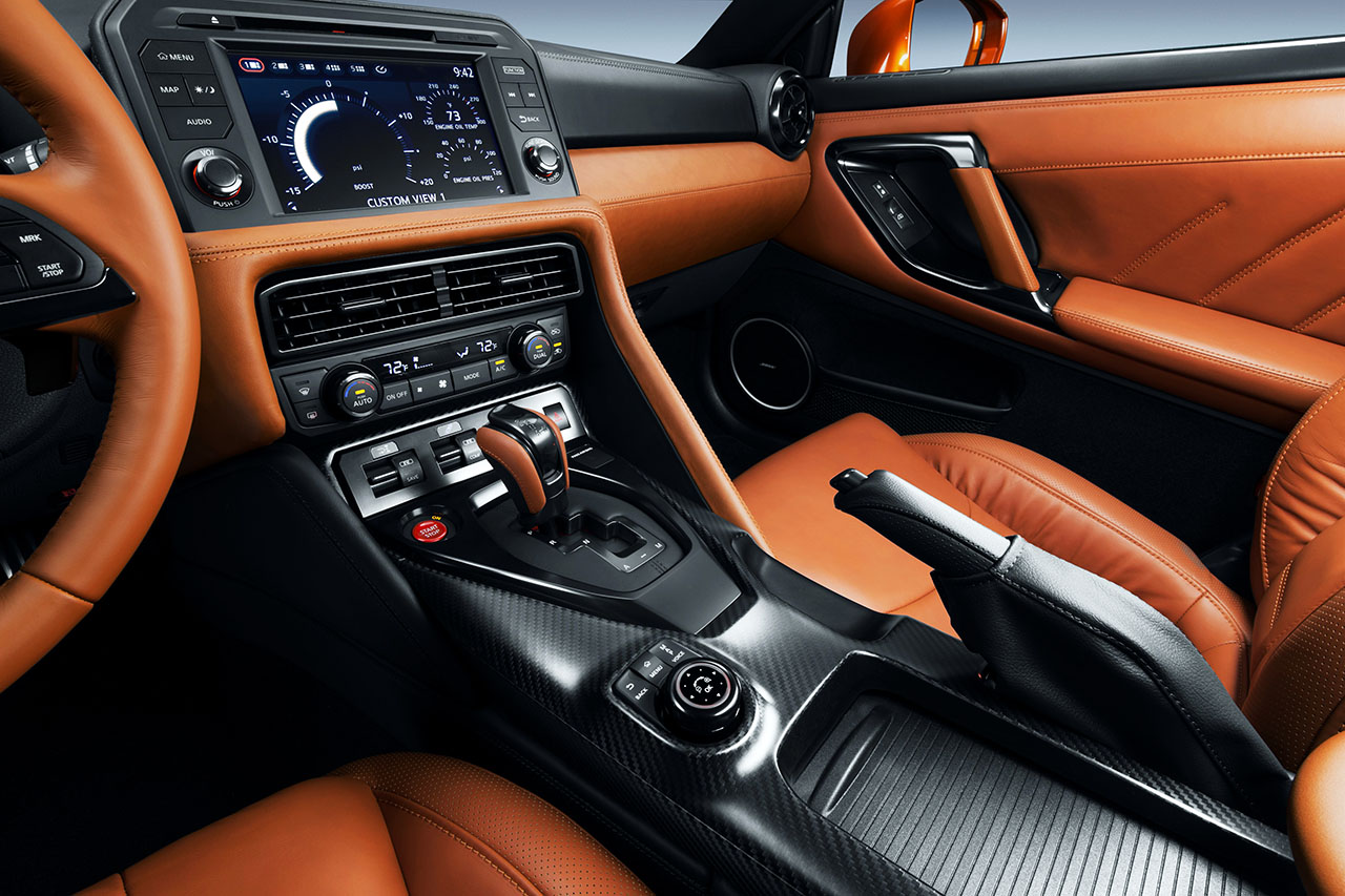 O formato da consola central foi igualmente melhorado e simplificado. Os controlos áudio e de navegação integrados reduzem o número de interruptores de 27 no modelo anterior para apenas 11 no novo Nissan GT-R. O sistema de infoentretenimento recebe agora um ecrã táctil de oito polegadas, que apresenta ícones grandes no ecrã para facilitar o seu manuseamento. Um novo comando de controlo do ecrã montado na consola central de fibra de carbono permite um manuseamento mais fácil.