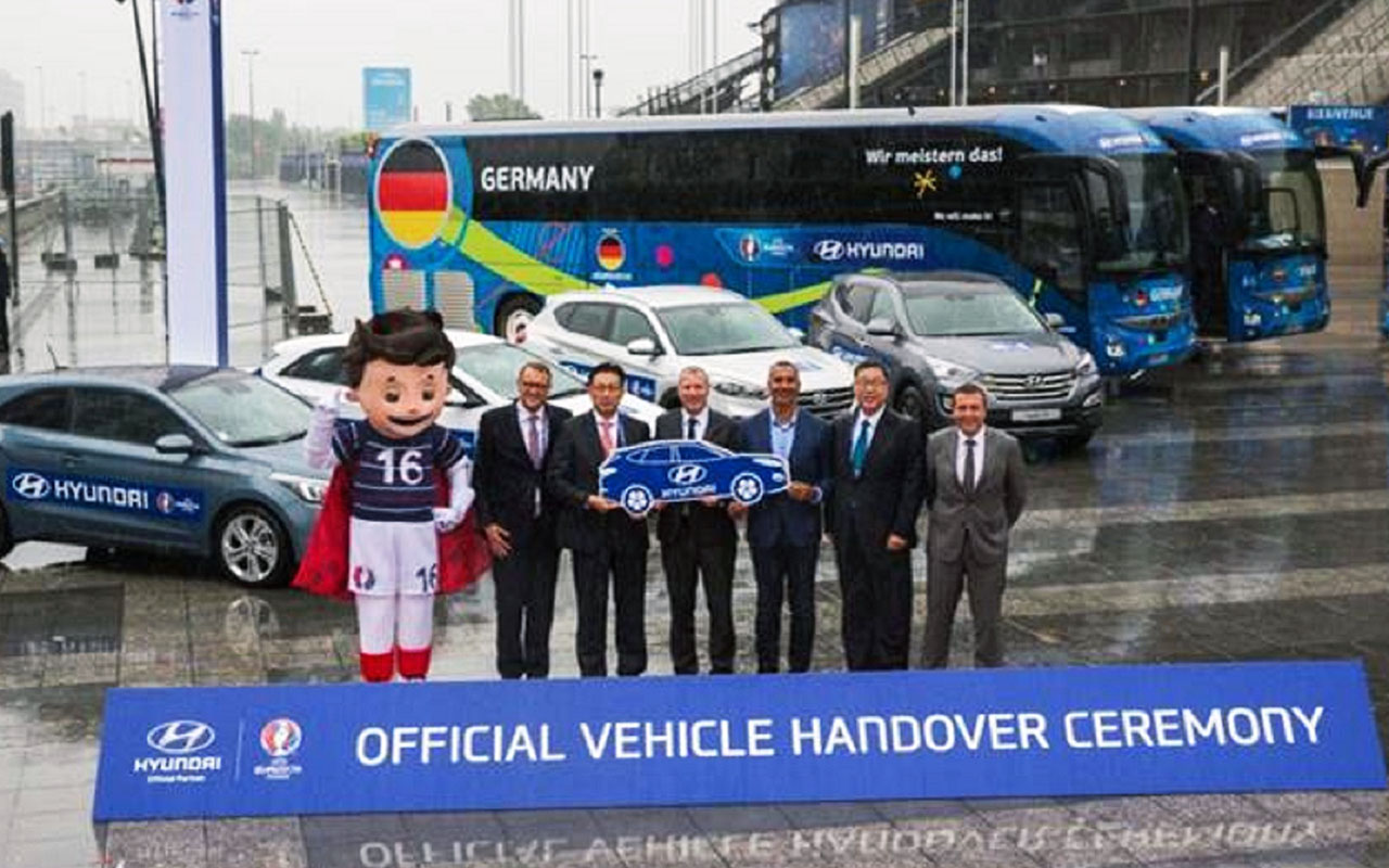 A cerimónia de entrega das chaves dos veículos decorreu em St. Denis, no Estádio Nacional Francês. Ao todo, a Hyundai forneceu 361 viaturas, no qual estão modelos como o Santa Fe, o novo Tucson e o novo i20, bem como modelos da Genesis, a marca de luxo do grupo Hyundai. A Hyundai será ainda promovida nos autocarros de 12 selecções que participam no Euro 2016.