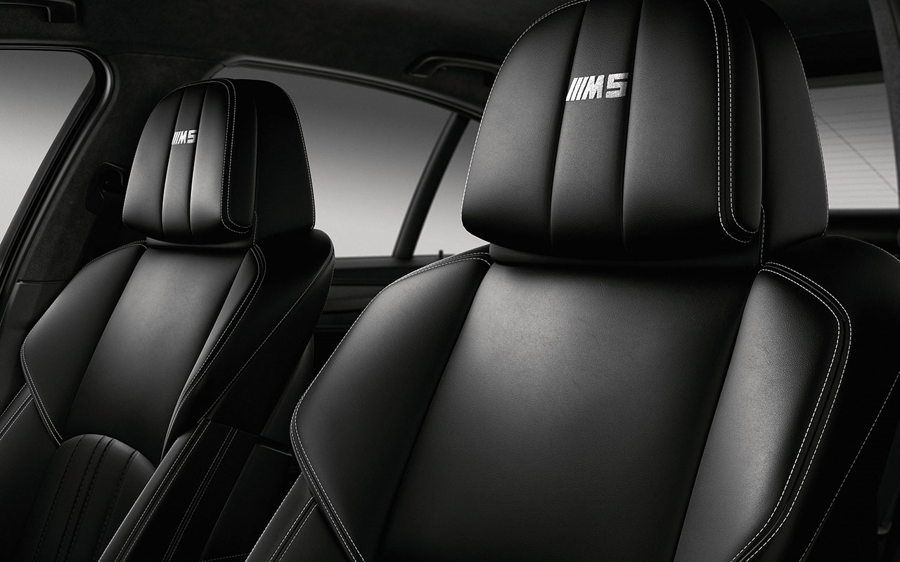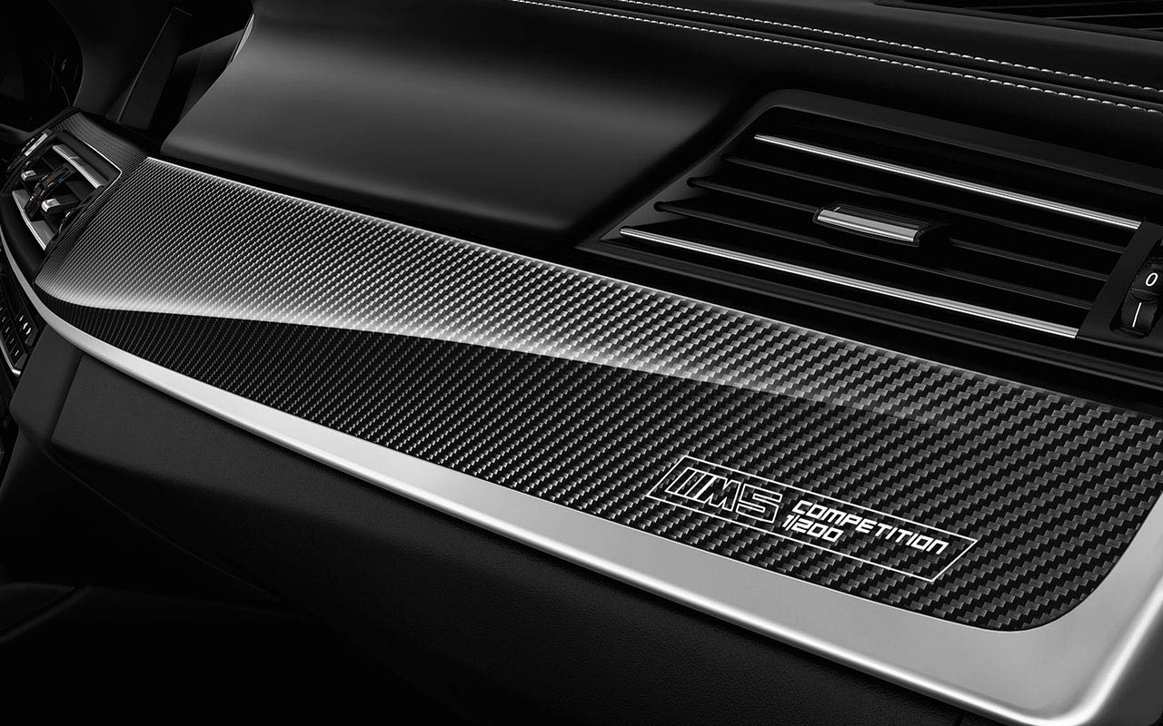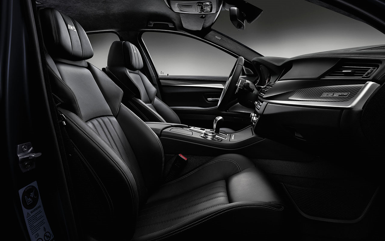 No interior destaque para as faixas em fibra de carbono com a sigla M5 Competition, bem como a devida numeração individual de cada unidade, e os diversos elementos forrados em pele preta Merino Black com costuras em contraste em brando Opal White, no qual se incluem os bancos desportivos de ajuste eléctrico. Nem mesmo os tapetes são os originais, sendo estes em tecido Antracite com rebordos em pele Merino Opal White. Igualmente presente está o sistema Head-Up Display, Assistente de alerta de saída da faixa de rodagem e o excelente sistema de som surround Bang&Olufsen de 1200 watts.