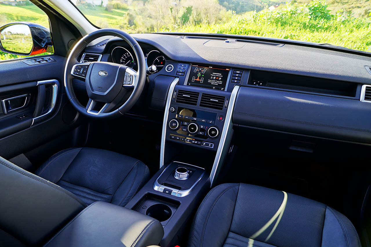 No interior as diferenças também são mínimas, estando presentes os mesmos bancos em pele que apesar de serem equipamento de série neste nível de equipamento, oferecem um excelente conforto, sendo o seu ajuste totalmente eléctrico. Atrás destaca-se o espaço oferecido a todos os ocupantes, existindo ainda a possibilidade de se optar pela instalação de dois lugares adicionais numa terceira fila de bancos (extra de 1371 euros), tornando este Discovery Sport mais atraente em termos de versatilidade e de fiscalidade (desde que opte pela versão 4×2).