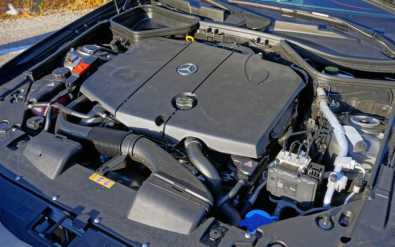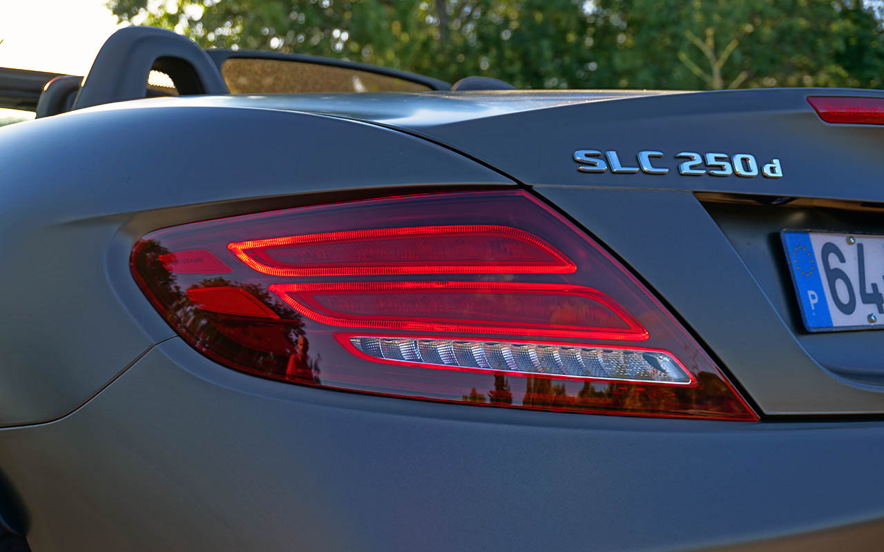 Quanto a motorizações, o SLC está disponível com quatro motores a gasolina, o SLC 180 de 156cv, SLC 200 com 184cv, SLC 300 com 245cv e SLC 43 AMG com 367cv, ou esta versão, o SLC 250d equipada com o conhecido 2.1 turbodiesel de 204 cavalos, que associado à já referida caixa 9G-tronic, garante médias de consumo surpreendentemente baixas. Apesar da ideia de associação de um motor diesel num roadster desportivo, o resultado surpreende, não só porque a sonoridade foi ligeiramente trabalhada, como pelo comportamento, visto que este motor possui 500 Nm de binário, o que garante algumas derivas controladas em curva sempre que o condutor desejar, tornando a experiência de condução mais emocionante.
