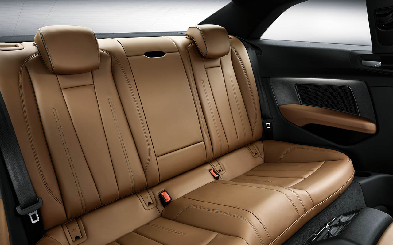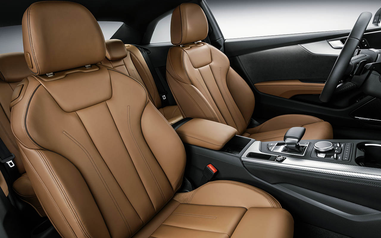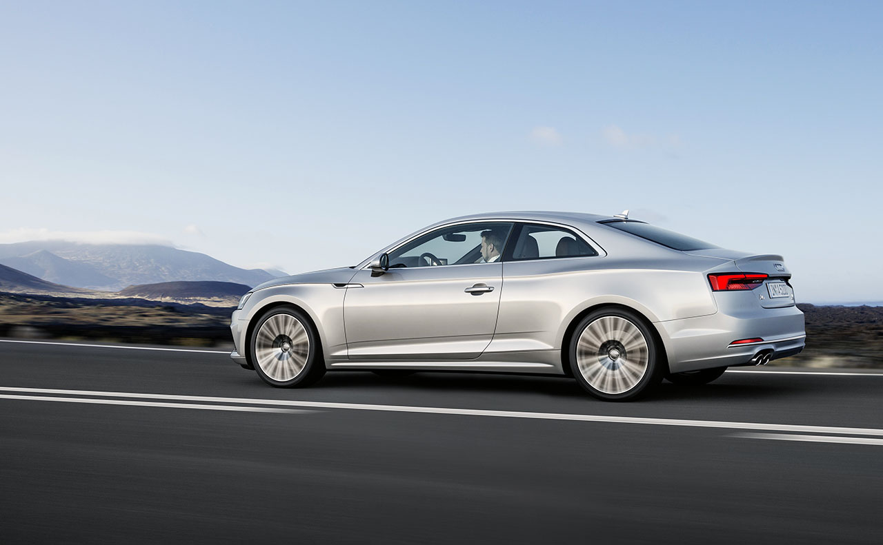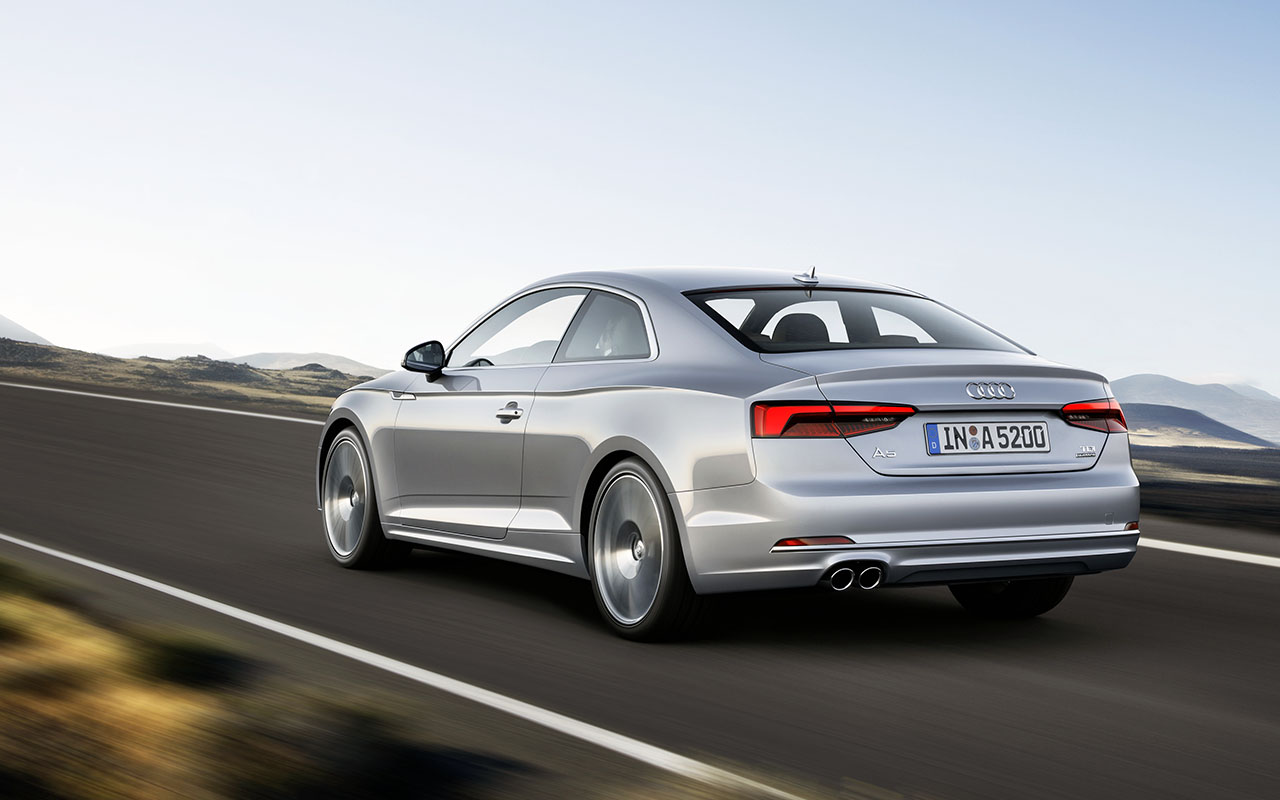 Recorrendo a um visual musculado com linhas modernas e de formas afiladas, o novo A5 utiliza uma linha de cintura em forma de onda, em formato tridimensional, que percorre toda a lateral do modelo, começando pelo capot , guarda-lamas e cavas das rodas. à frente destaca-se os novos conjuntos ópticos que podem ser totalmente em LED ou usar o sistema Matrix LED, bem como a nova grelha Singleframe mais plana e ampla que a anterior geração. Atrás destaque para os farolins totalmente em LED de série.
