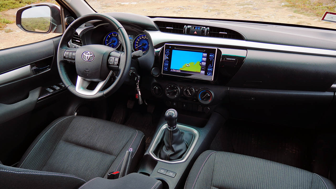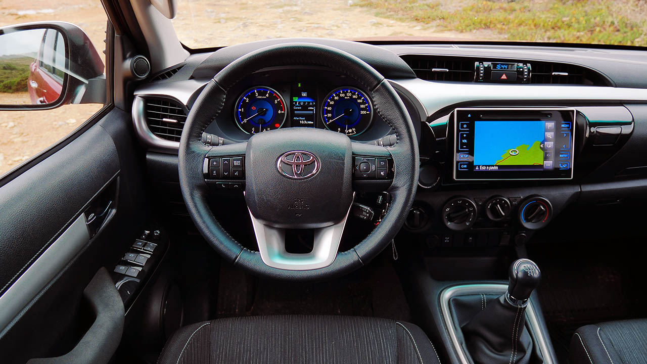 Porém, neste modelo em concreto de cabine dupla, a Hilux surpreende pelo conforto e soluções utilizadas, desde o painel de instrumentos moderno com ecrã central colorido para a visualização das funções do computador de bordo, ar condicionado, vidros eléctricos, modos de condução (Power e ECO) e o sistema de infoentretenimento, composto pelo conhecido Toyota Touch 2, com ecrã táctil de 7 polegadas, com navegação e acesso a aplicações online. Nem câmara traseira foi esquecida, estando esta integrada de forma impecável e discreta no puxador de abertura da tampa da mala.