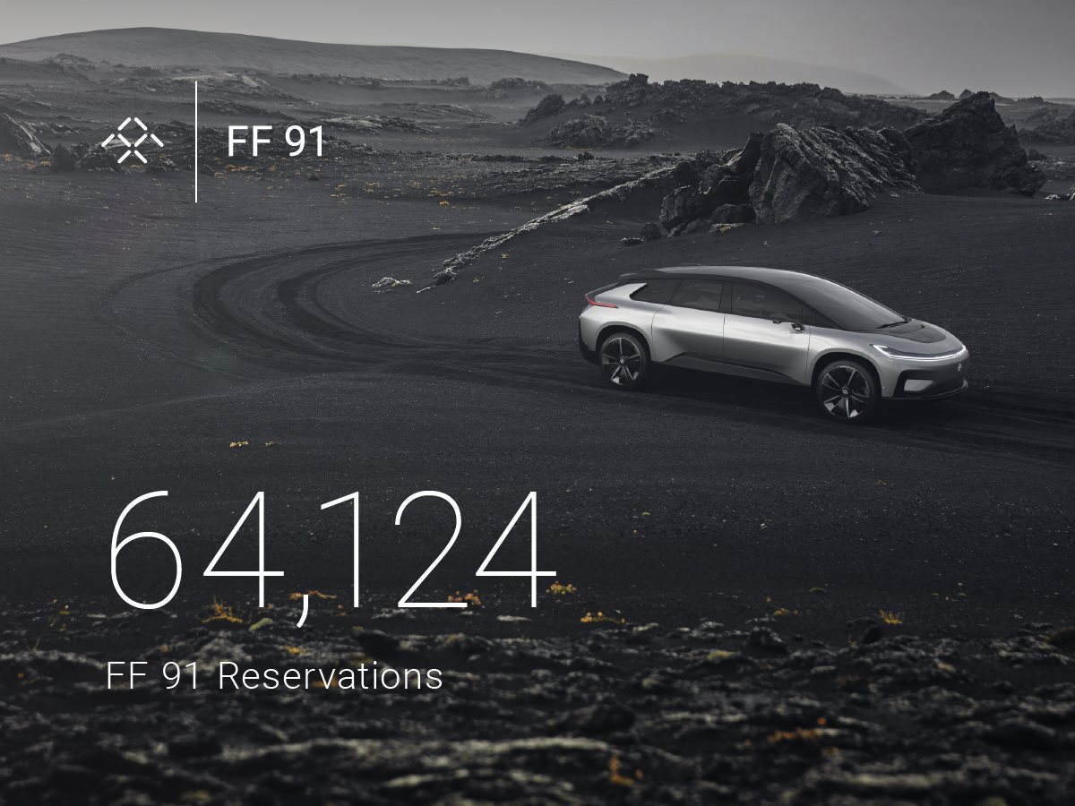 O impressionante FF 91, o primeiro modelo da Faraday Future, que foi apresentado durante a feira de tecnologias CES, em Las Vegas, registou 64.124 reservas em menos de 36 horas. O período de reserva, que iniciou logo a seguir à sua apresentação, que decorreu na terça-feira passada. Este resultado está aquém do obtido pela Tesla, com o modelo de pré-reservas para o futuro Model 3, porém este valor surpreendeu até os responsáveis da marca, visto que a Faraday Future ainda não produziu um único veículo (este é o seu primeiro modelo), que só deverá ver a sua produção iniciada em 2018.