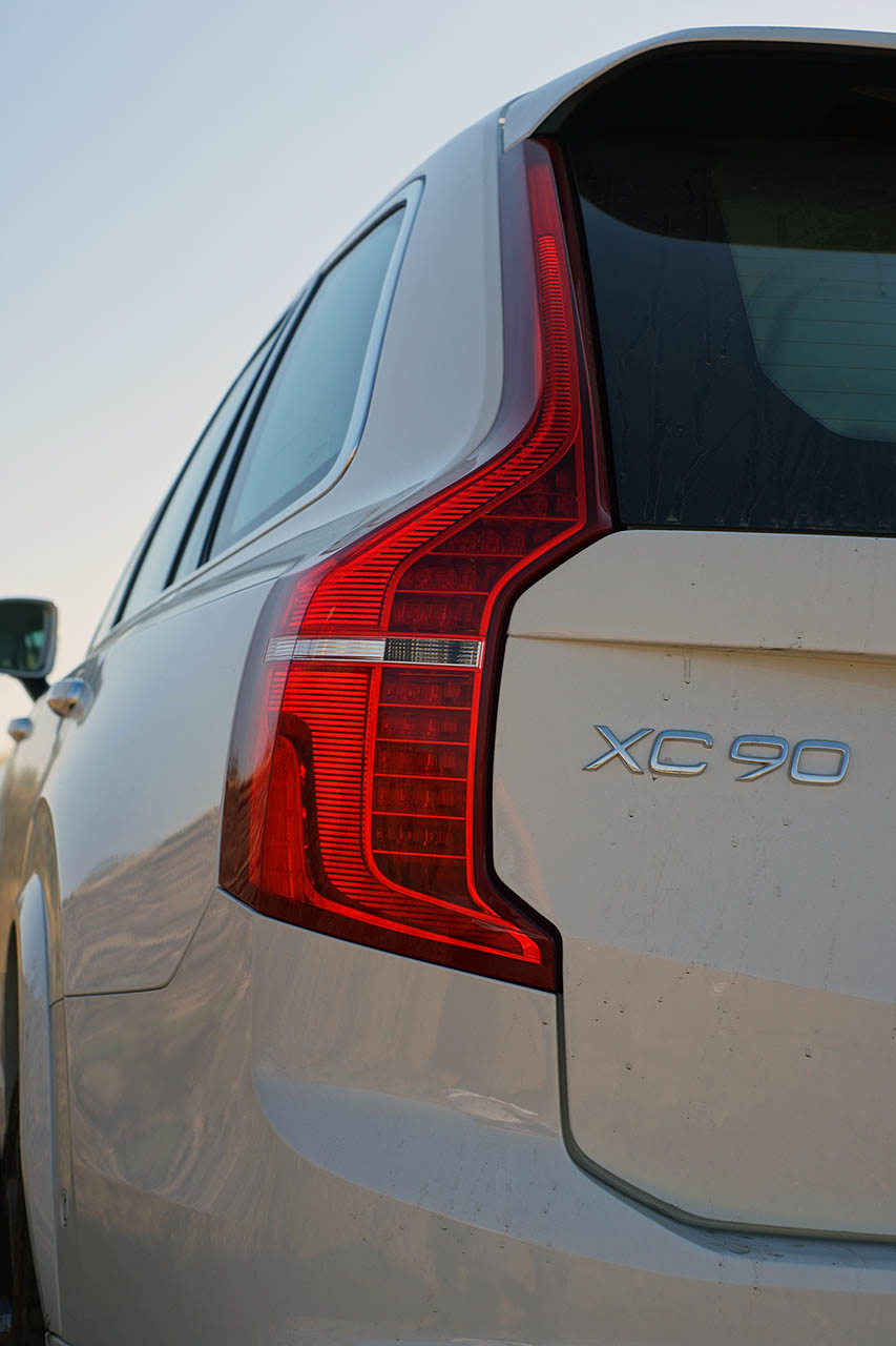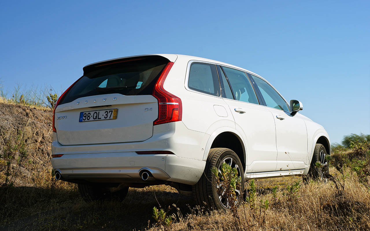 Atrás o resultado não é tão deslumbrante, embora as linhas utilizadas sejam bastante cativantes, mantendo-se as tradicionais luzes verticais, que seguem até ao topo do pilar C, sendo estas igualmente em LED. A complementar o desenho exterior do novo XC90, é frequente encontrar um a circular na rua com umas enormes, embora elegantes, jantes de liga leve de 18, 19 ou 20 polegadas (20, neste caso em concreto), que combinam na perfeição com o desenho desportivo dos pára-choques utilizados. O resultado é deveras apelativo, especialmente para um veículo destas dimensões.