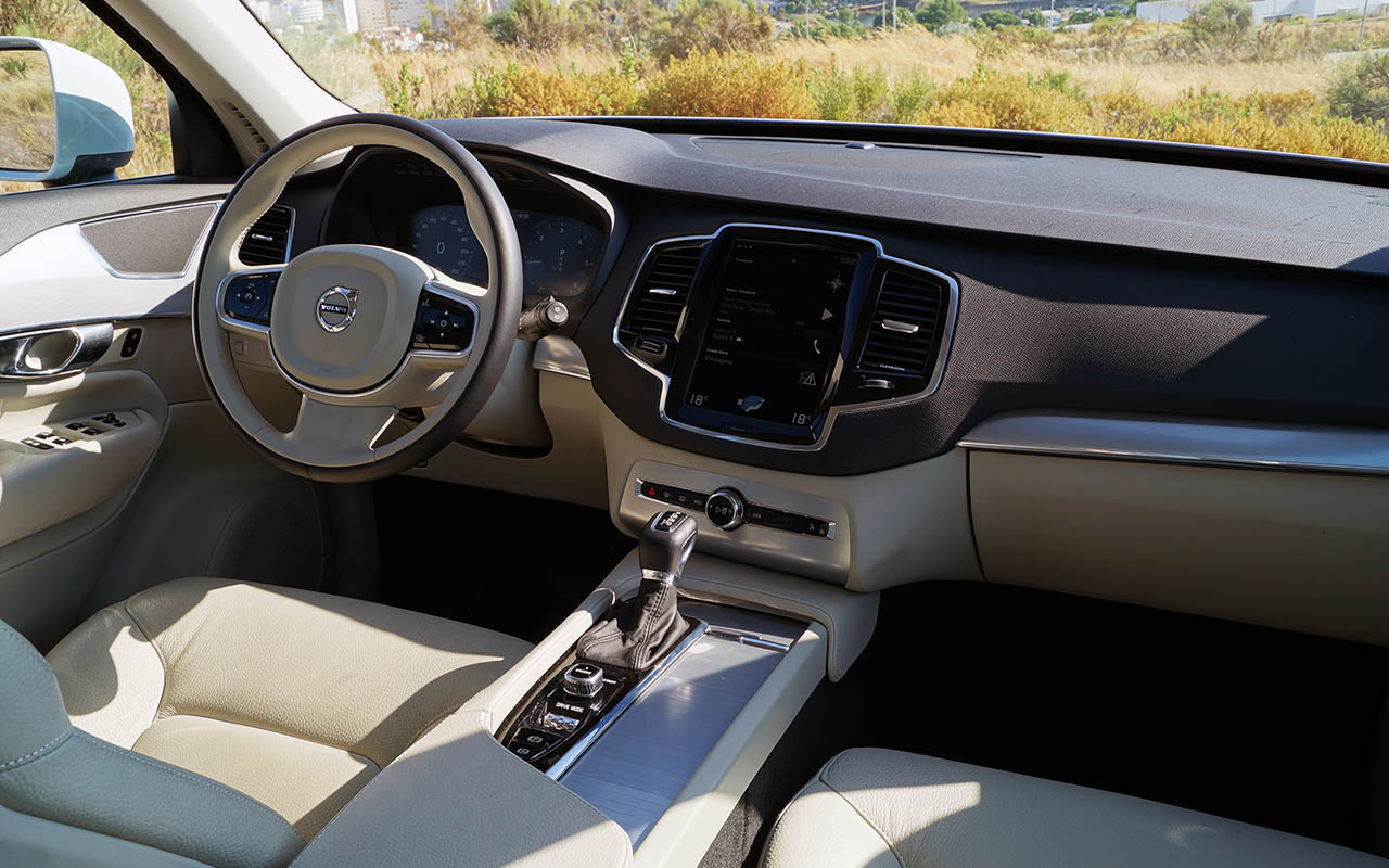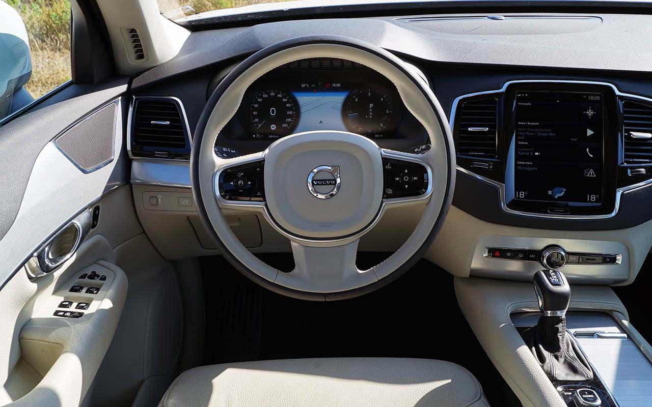 Se por fora ainda o XC90 impressiona, por dentro este ira deixa-lo boquiaberto. Logo para começar temos um interior recheado de materiais de elevada qualidade em todos os pontos, mas o elemento que mais se destaca é o enorme ecrã de 9 polegadas colocado na consola central, servindo este de elemento de ligação a toda a instrumentação a bordo deste veículo. Através do ecrã do sistema Sensus, que funciona como se fosse um tablet, terá acesso não só à navegação, como aos obrigatórios sistemas de emparelhamento bluetooth com o seu telemóvel, acesso ao rádio, entradas multimédia ou até a espelhar o ecrã do seu smartphone no ecrã do sistema, através das plataformas Apple CarPlay ou Android Auto, embora este último tenha um funcionamento algo limitado, pela falta de suporte com dispositivos.