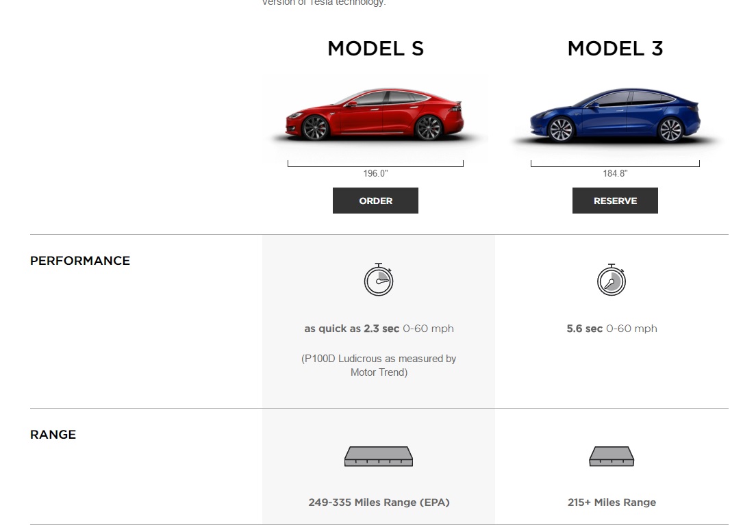 Nesta comparação, poderá comparar o desempenho em termos de velocidade de aceleração para atingir os 100 km/h, o alcance das baterias, o tipo de utilização na rede de supercarregamento Tesla, a capacidade em termos de passageiros, capacidade da carga, o tipo e dimensão dos ecrãs tácteis utilizados, as possibilidades de configuração e a estimativa de entrega após encomenda, bem como as já referidas características adicionais que o Model S tem perante o Model 3. Poderá consultar a página em www.tesla.com/compare.