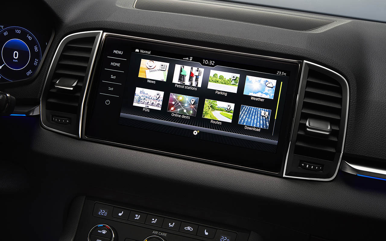 Em termos de sistemas de infoentretenimento, estão disponíveis os mais recentes módulos do Grupo, que recorrem a ecrãs tácteis de grandes dimensões, ligação à internet através do opcional módulo LTE, dispõem de hotspor Wi-Fi (nos sistemas Columbus e Amundsen), podendo a ligação à internet ser usada para os serviços móveis Skoda Connect. Pode ainda emparelhar com o seu smartphone através da funcionalidades SmartLink+, compatível com MirrorLink, Apple CarPlay e Android Auto.