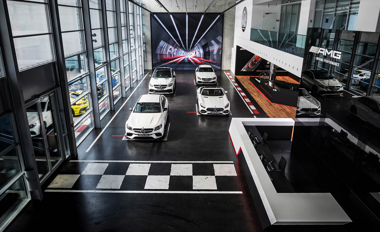 O salão de exposição da Mercedes-AMG em Affalterbach reabriu com um novo visual após uma remodelação de doze semanas. O renovado salão conta com um novo design, que usa como tema as pistas de corrida, o ambiente de origem da marca no desporto automóvel. Como tal, é notória a presença de elementos como o revestimento especial do chão com as clássicas marcas da grelha de partida, as marcas de borracha dos pneus no piso e a linha de partida e chegada.