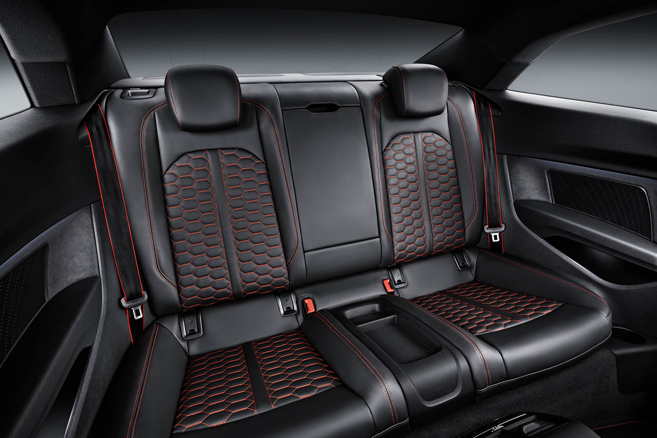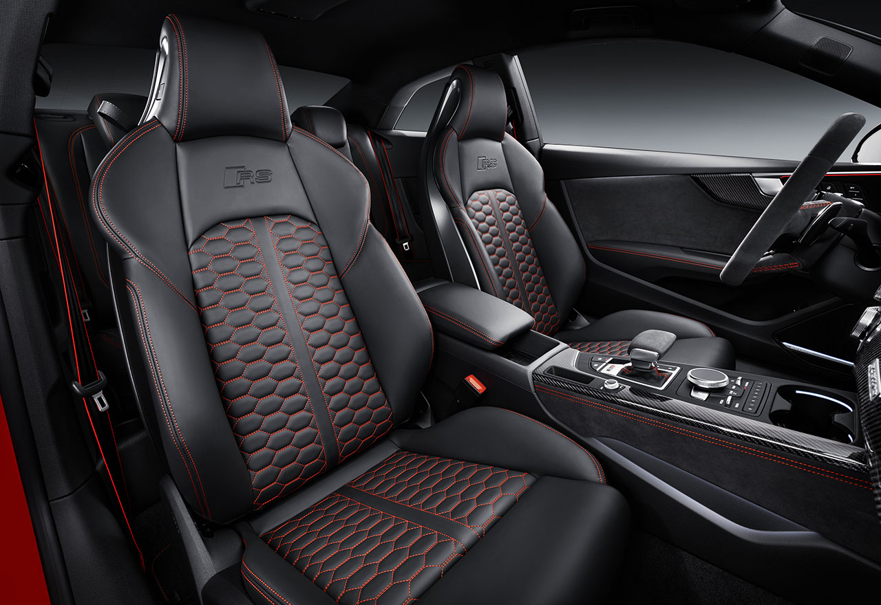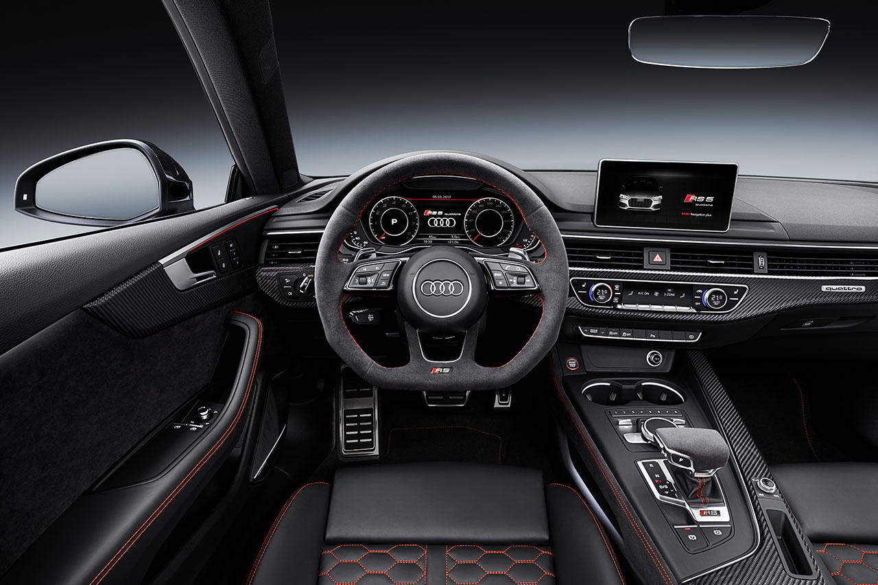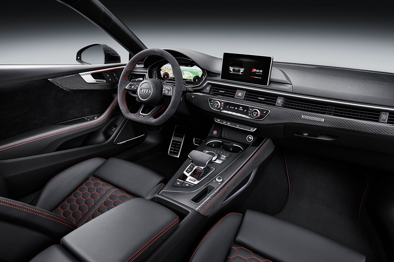 Se por fora o novo Audi RS5 Coupé não tem problemas em diferenciar-se, imagine o trabalho efectuado no interior. Poderá contar com um interior totalmente em preto, com acabamentos em pele e camurça, com pespontos em linha encarnada para a criação de contraste em todo o interior, desde os bancos, passando pelas forras das portas, volante desportivo multifunções, entre outros. Poderá contar com tecnologias como Head-Up display aos mais avançados sistemas de assistência à condução.