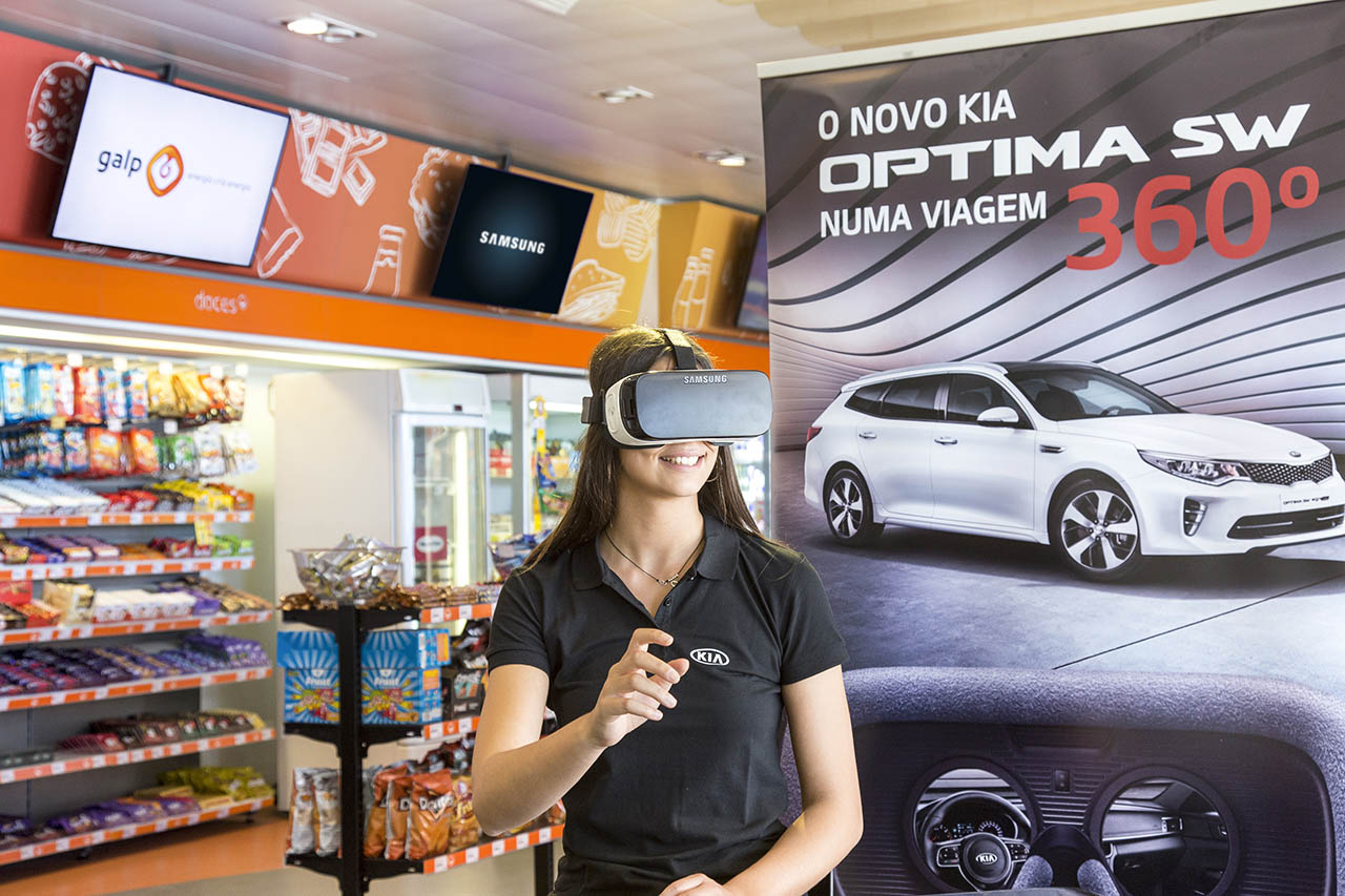 Através de uma parceria com a Samsung e a Galp, já é possível efectuar um test-drive virtual de um automóvel KIA, através de um expositor que estará disponível nas mais importantes lojas Tangerina Galp. Este expositor terá um conjunto de óculos Samsung Gear VR, equipados com filmes de realidade virtual da KIA, que permitirão ao consumidor dar um salto para o mundo da Realidade Virtual, sendo possível agendar, posteriormente, um test-drive real ao modelo KIA escolhido.
