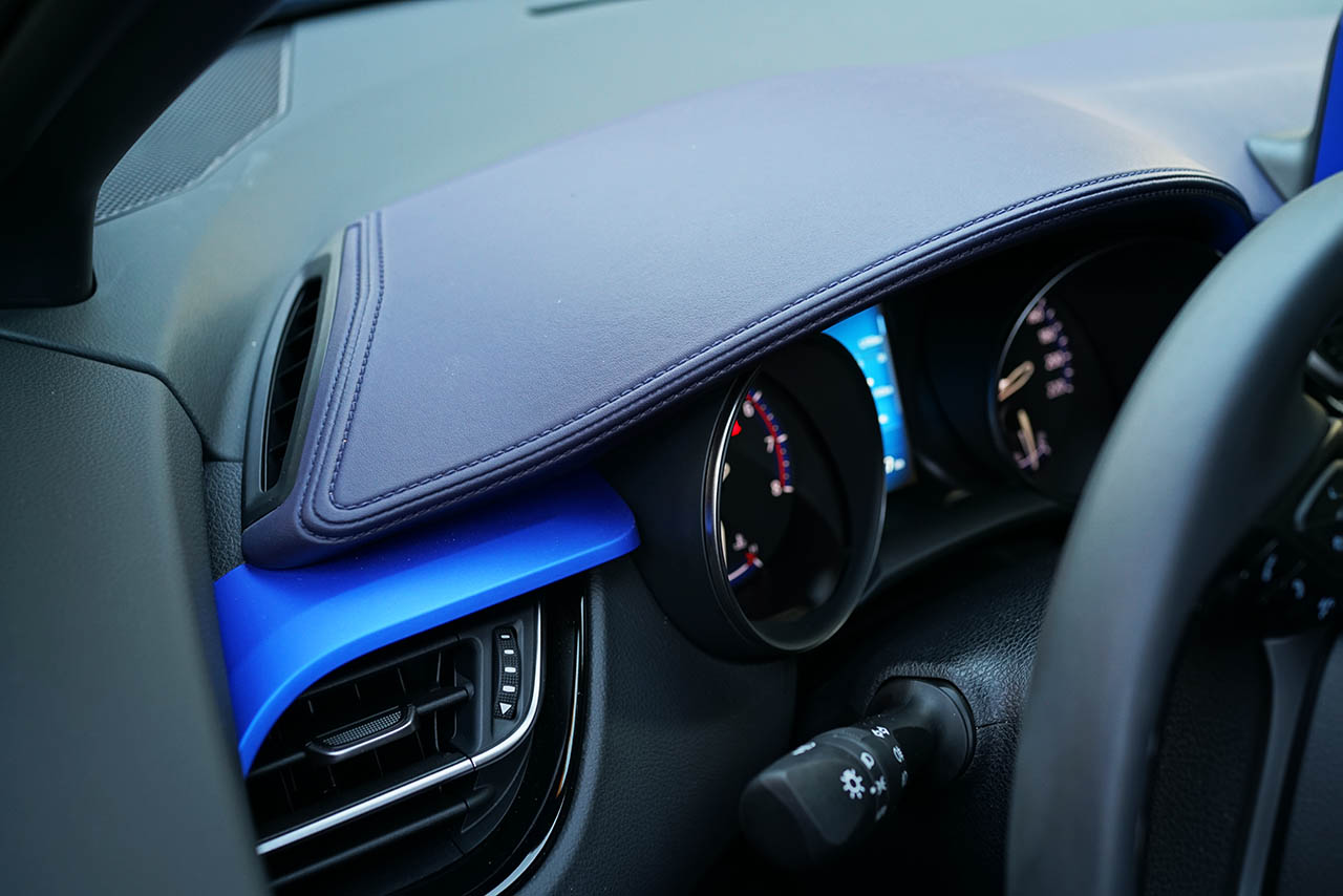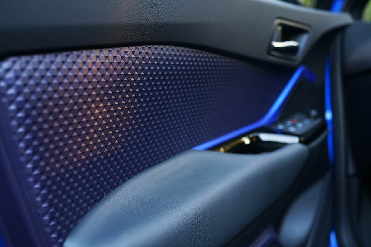 Logo para começar temos um tablier completamente fora do habitual na Toyota. Acabou-se as enormes superfícies com plástico brilhante e formato rectilíneo. Os plásticos brilhantes permanecem, mas desta vez são curvos, e integram-se na perfeição com outros elementos com um acabamento acima do esperado para o segmento, como pele com pespontos, superfícies com acabamento em borracha e superfícies suaves e maleáveis. A estas superfícies junta-se o padrão do diamante, presente em inúmeros elementos, como as forras das portas, no forro do tejadilho, nos botões do volante ou até mesmo no sistema de climatização. Este último ponto representa bem o empenho da Toyota neste modelo, uma vez que, à semelhança de praticamente todos os fabricantes, também a Toyota utiliza os mesmos componentes para o sistema de climatização em todos os (restantes) modelos.