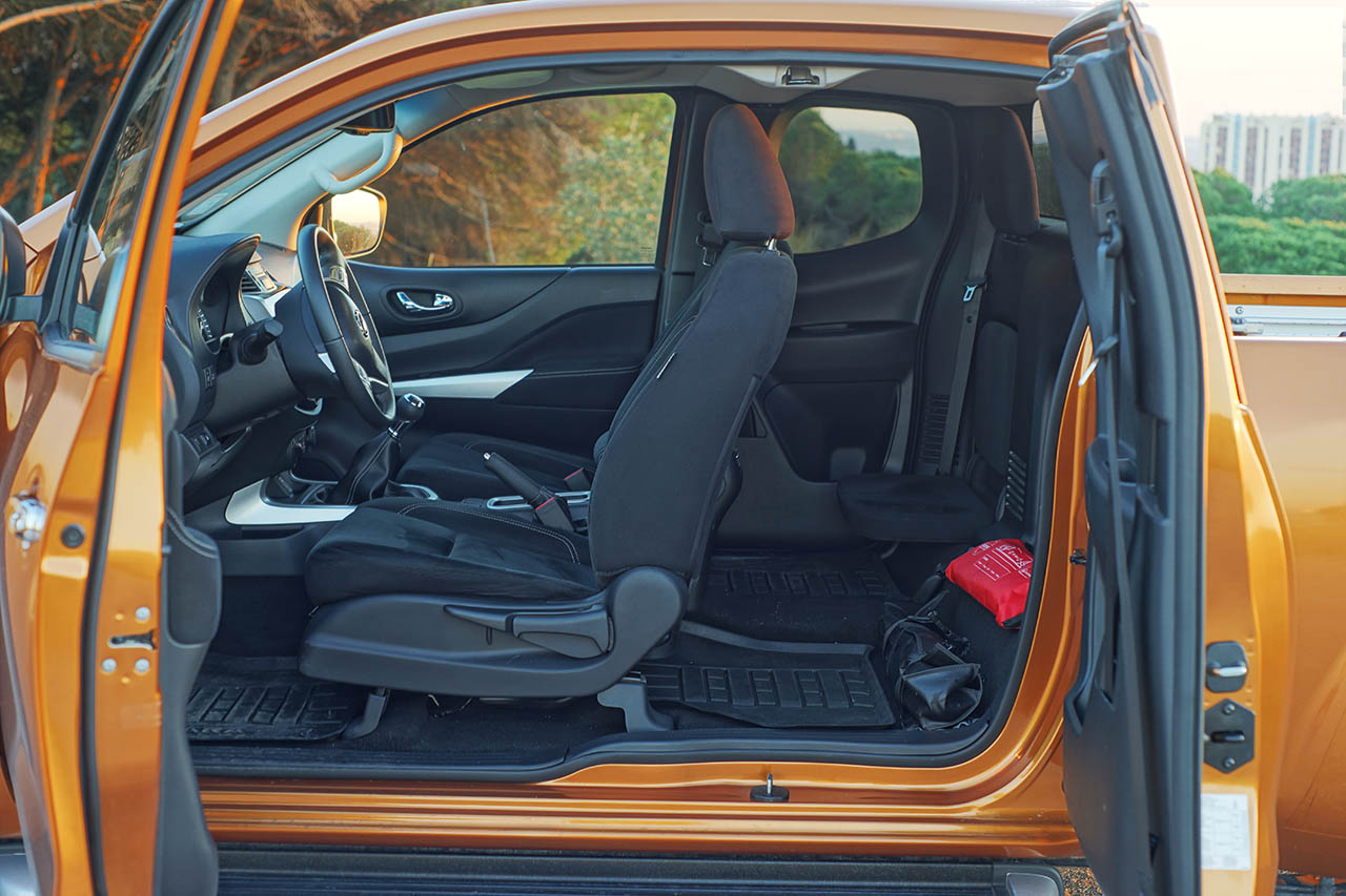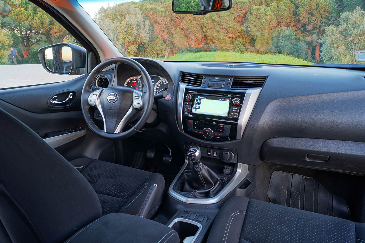 Assumindo que encontrará espaço mais do que suficiente para dois ocupantes, e um terceiro temporário, esta Nissan Navara King Cab é, no interior, praticamente idêntica a um Nissan X-Trail, estando equipada com uns confortáveis bancos, sistema de infoentretenimento com ecrã táctil de 7 polegadas, navegação e sistema Nissan Connect, no qual está incluído o sistema de câmaras de 360 (solução única neste segmento). Este sistema é particularmente útil quando pretendemos estacionar um “monstro” de 5,225 metros de comprimento, bem como para algumas aventuras mais radicais fora de estrada, visto que o sistema pode funcionar até aos 10 km/h.