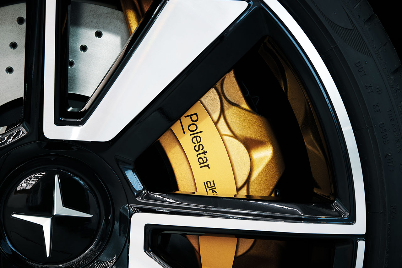 Outro parceiro que a Polestar recorreu foi a Akebono, que desenvolveu um poderoso sistema de travagem que recorre a discos de 400 mm de diâmetro e bombas de travagem de seis êmbolos. Para garantir um comportamento em curva perfeito, os dois motores eléctricos que actuam no eixo traseiro recorrem a um conjunto com rodas planetárias, de modo a conseguir criar um verdadeiro sistema de vectorização de binário que, ao contrário dos tradicionais sistemas, não travam a roda interior, evitando abrandamentos em curva.