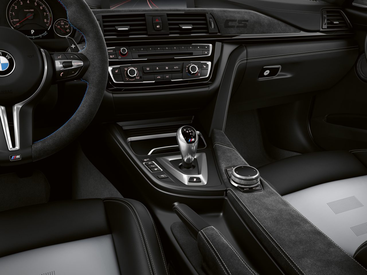 No interior dominam materiais como a Alcantara, cozida com costuras com as cores da divisão M da BMW (Branco, Azul e Vermelho) em elementos como o volante, consola central, alavanca da caixa de velocidades e fole do travão de mão. O original botão de arranque (Start) é vermelho, e os bancos desportivos (Tanto dianteiros como traseiros) são oriundos da versão Competition Package.