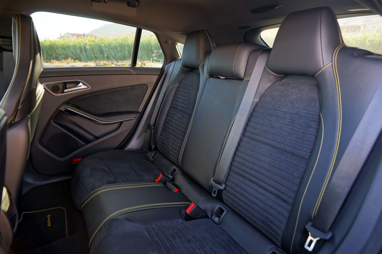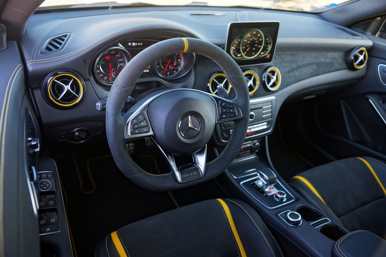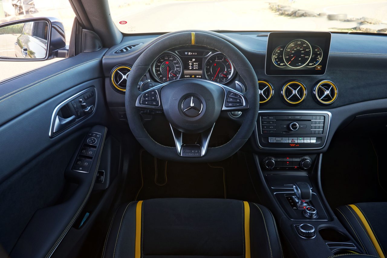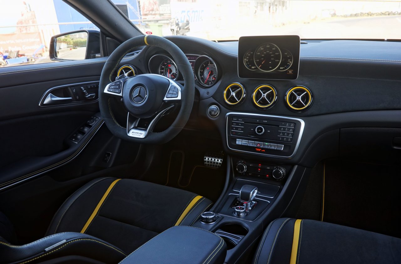 Por dentro encontrará um interior que combina bancos desportivos da Recaro que combinam pele com tecido ao centro com faixas e costuras amarelas, tapetes AMG também com costuras amarelas, molduras das saídas do ar condicionado em amarelho, tablier forrado em pele e volante em alcantara, com faixa central em amarelho. Por se tratar de uma versão AMG, a manete da caixa de velocidades está integrada na consola central, como nos modelos com caixa manual, estando embutido um comando rotativo que permite escolher o modo de condução desejado. Este permite ajustar o funcionamento do motor, da suspensão adaptativa, da caixa de velocidades e alterar a actuação do sistema ESP.