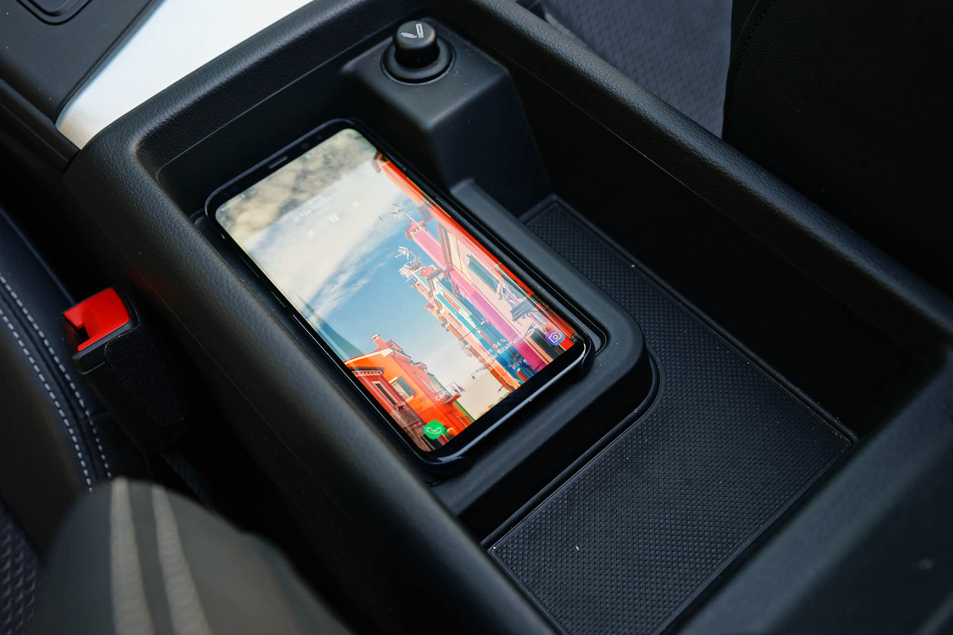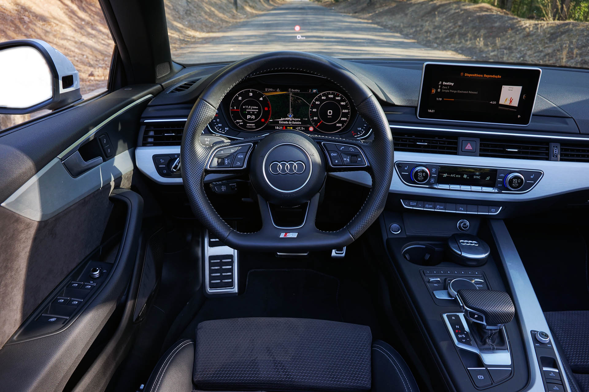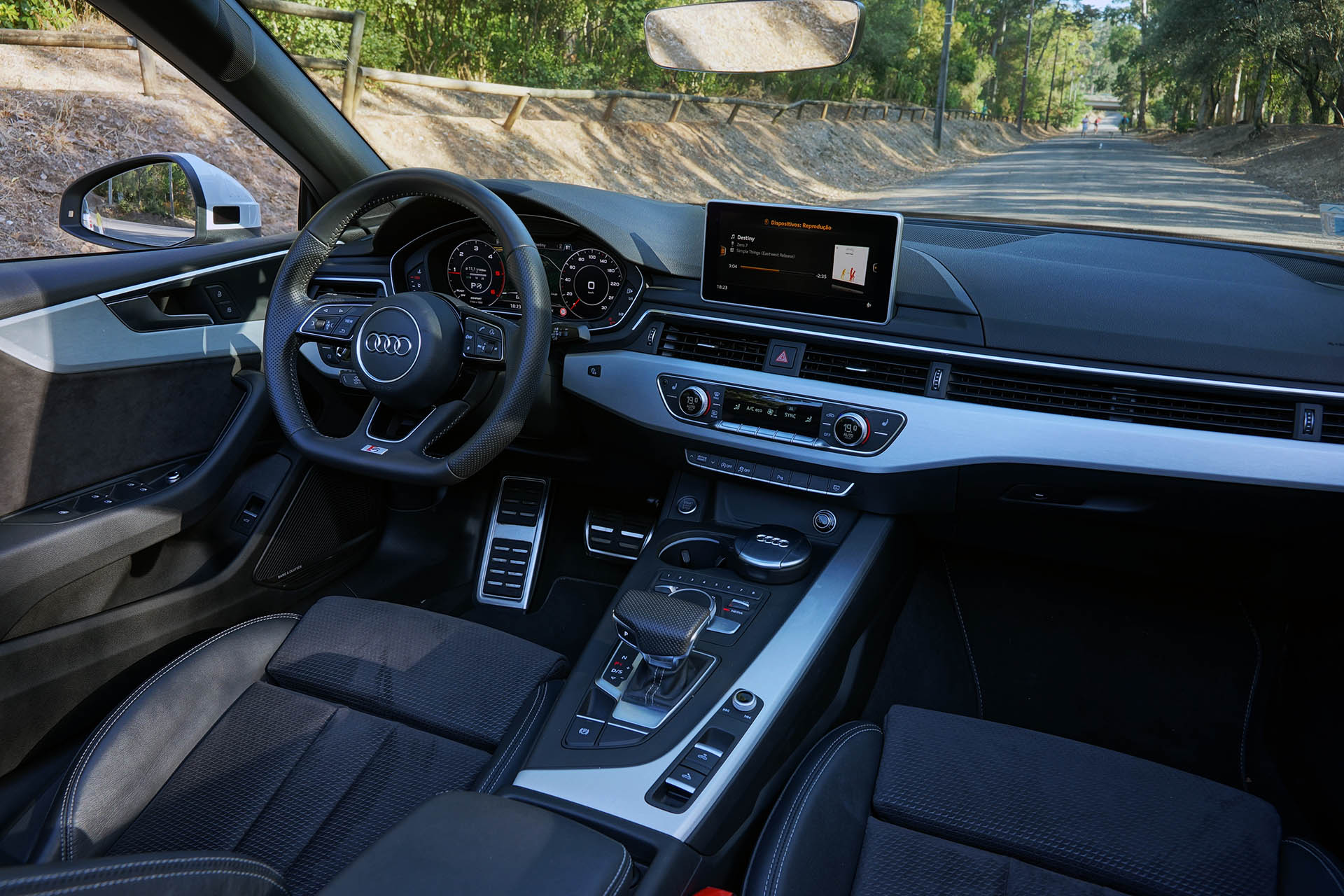Estou a falar do já conhecido sistema MMI Navigation Plus com ecrã de 8,3 polegadas, que continua a não ser táctil, bem como obriga o uso do comando rotativo com touchpad MMI Plus, que não é dos sistemas mais intuitivos para usar em conjunto com as plataformas Android Auto e Apple CarPlay. Este sistema incluí o excepcional sistema de som da Bang & Olufsen, composto por 19 altifalantes e um amplificador com DSP (processamento de som digital) de 16 canais de 750 Watts de potência. Estava também presente a Audi Phone Box, um compartimento que permite carregar por indução a bateria de dispositivos móveis compatíveis.