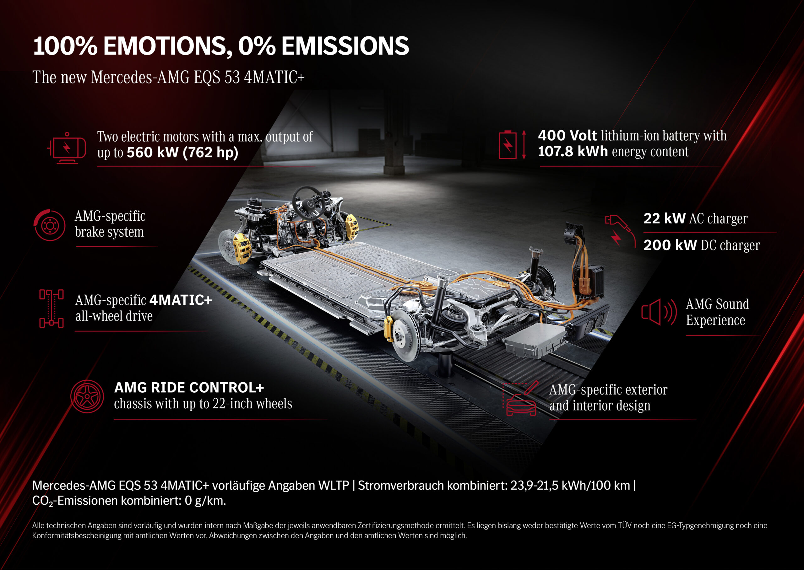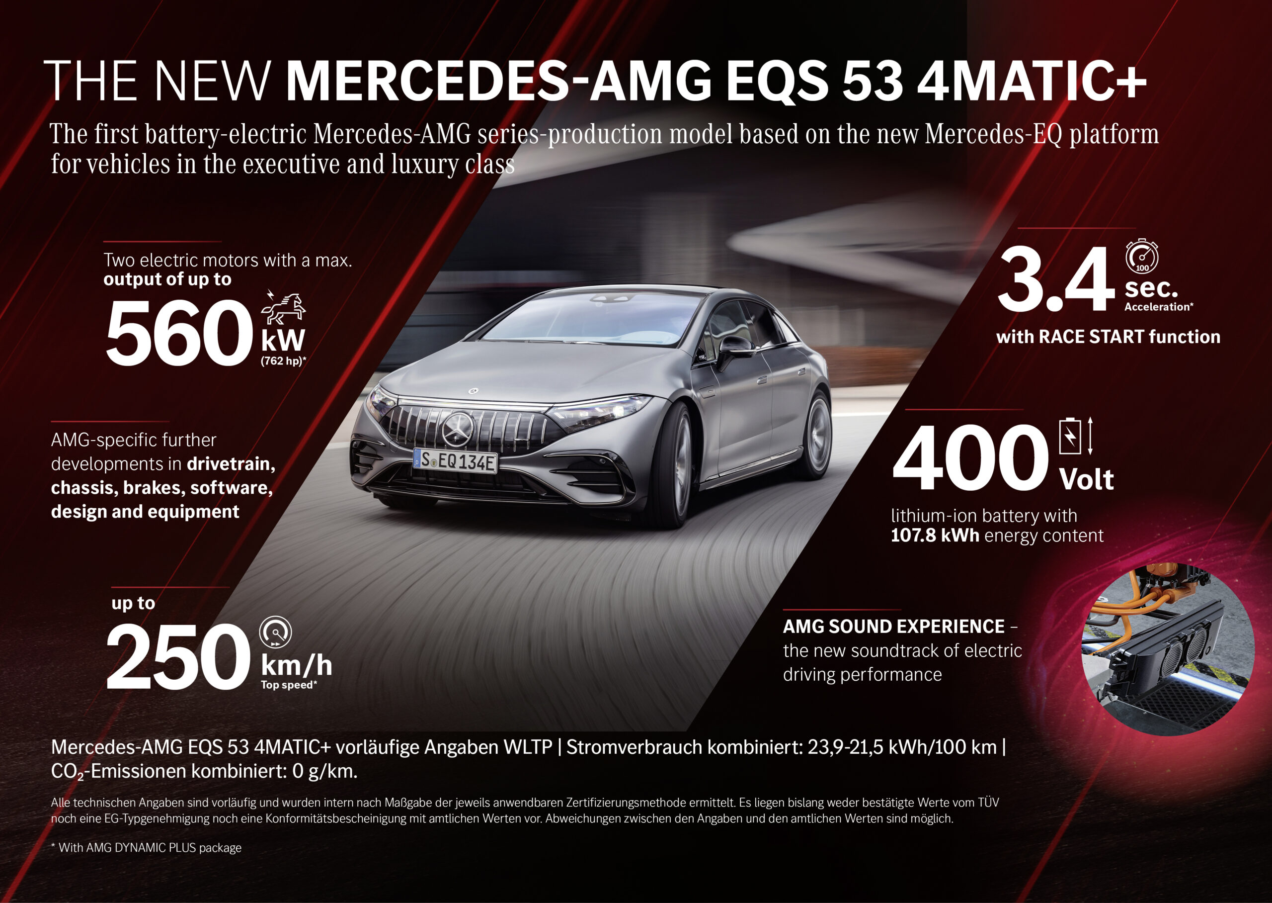 Porém, para quem desejar mais, a Mercedes-AMG disponibiliza o opcional pacote Dynamic Plus, que permite elevar a potência máxima para os 560 kW (762 cv), e o binário máximo para 1020 Nm, quando utilizada a função Boost do modo de condução Race Start. Isto permite ao Mercedes-AMG EQS 53 4MATIC+ atingir os 100 km/h em apenas 3.4 segundos, e uma velocidade máxima de 250 km/h.