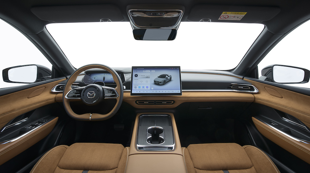 O interior reflecte a estética japonesa ‘Ma’, marcada pela «simplicidade e serenidade». O habitáculo «privilegia o espaço e a luz natural», sublinha a Mazda, com tejadilho panorâmico, iluminação ambiente personalizável e bancos mono-forma em materiais como o couro Tan Nappa e o Suede.