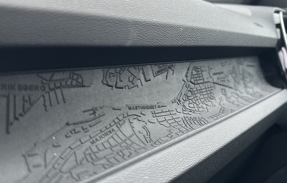 Na linha do EC40, o cockpit é dominado por painéis em borracha texturizada com um mapa estilizado de Gotemburgo, como se este modelo fosse um convite para descobrir a geografia da cidade que viu nascer a marca. Nas portas estão as ilhas de Brännö e Asperö, no tablier surgem Torslanda e Biskopsgården e, do lado do passageiro, seguimos para Kålltorp, Sävedalen e o lago Härlanda Tjärn. Para um condutor português, estes nomes dizem pouco, mas a intenção está lá: elevar subtilmente a experiência e diferenciá-la dos EX comuns.