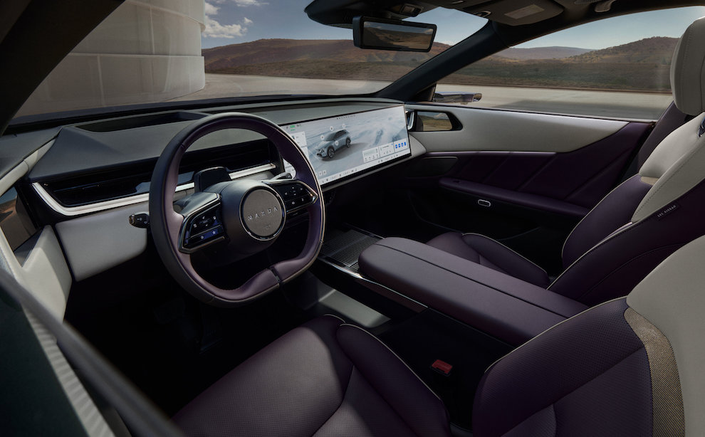 No habitáculo, o CX-6e representa uma ruptura clara com o passado recente da Mazda: desde logo, temos um ecrã tátil de 26 polegadas, dividido em dois painéis personalizáveis. Este elemento passa a ser o «centro de toda a experiência digital», apoiado por um head-up display de «grandes dimensões» que projecta navegação e informação directamente no campo de visão do condutor.