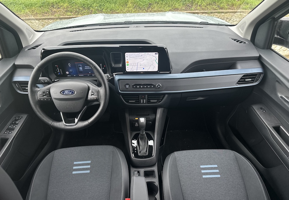 À frente, o ambiente muda de tom. O habitáculo assume uma identidade muito analógica, quase totalmente dominada por plásticos, do tablier às portas (a excepção surge numa pequena zona forrada a tecido, igual ao dos bancos). Os estofos Black com inserções em Nordic Blue são de série nesta versão, tal como o volante forrado a couro sintético Sensico. Aqui não há grandes ecrãs nem exuberância digital, um sinal claro de uma abordagem mais profissional e funcional da Ford.