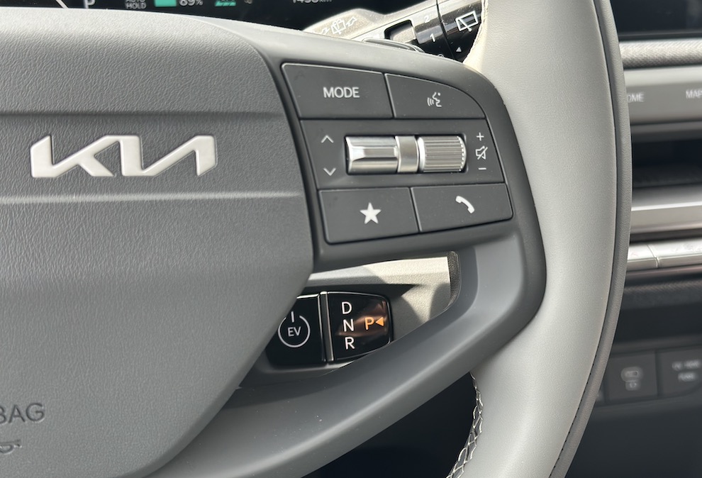 Em “troca”, a Kia oferece uma solução interessante: uma base deslizante, com efeito “flutuante”, que avança ou recua e concentra botões de condução como auto hold, câmara traseira, sensores de estacionamento e controlo de descida. Esta peça também pode servir de pequena mesa para uma refeição, uma bebida ou um portátil, útil para trabalho em movimento.