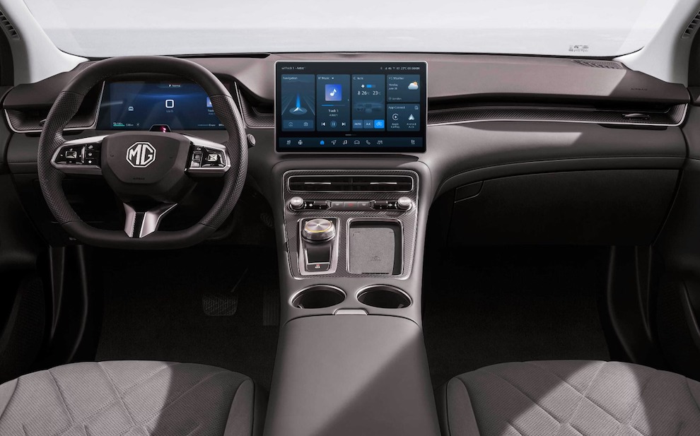 Por fora, a mudança é «mais evidente», diz a MG: este EV mostra uma nova disposição horizontal do tablier, ecrã central de 12,8” com Apple CarPlay e Android Auto sem fios, painel de instrumentos digital de 7” e uma interface de infoentretenimento «simplificada».
