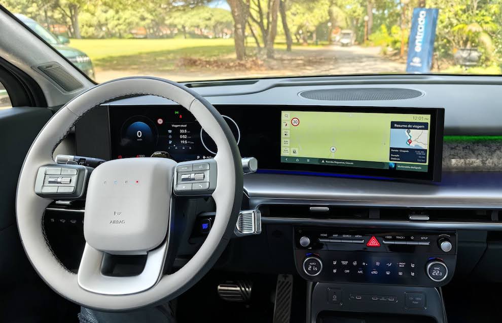 Este Hyundai tem uma excelente ergonomia, ainda tem alguns controlos manuais (doseando bem a parte digital e física), a interacção com o painel é fácil e intuitiva, a qualidade dos materiais usados é evidente e está cheio de funcionalidades úteis como os USB ou fichas eléctricas que através do V2L permitem carregar seja o que for.