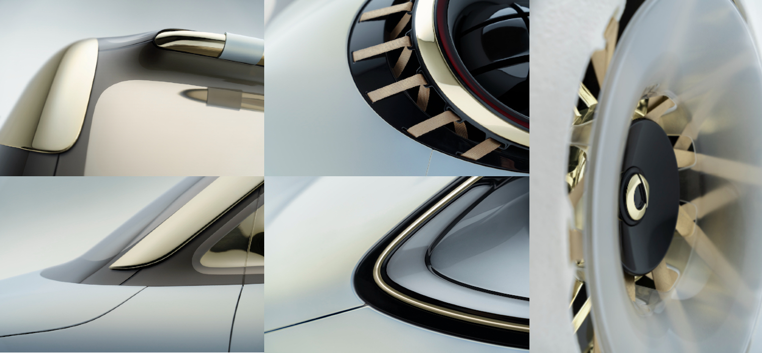 O exterior surge com acabamento bicolor em «branco mate e dourado quente», complementada por «linhas depuradas e detalhes meticulosos, como fivelas e aplicações em pele, que evocam o minimalismo moderno e uma linguagem estética premium», descreve a marca.